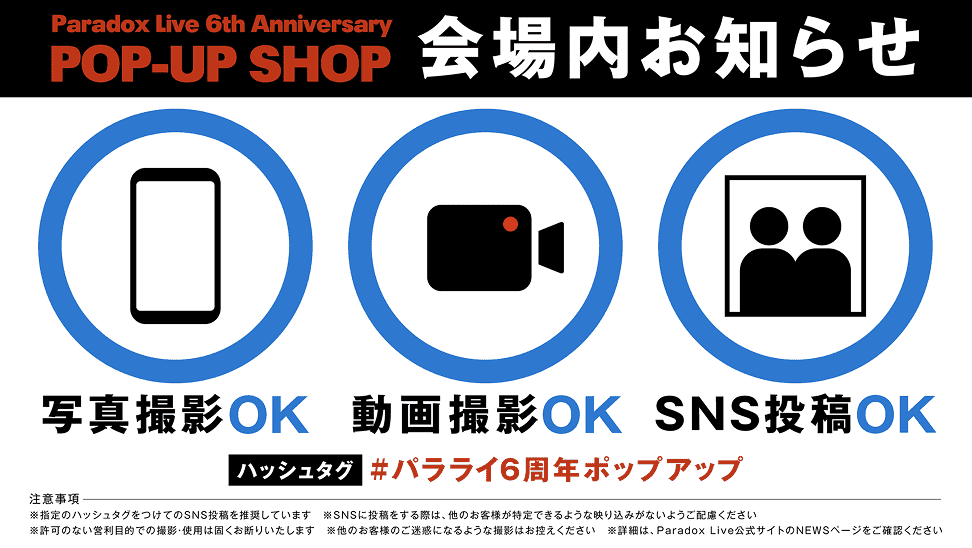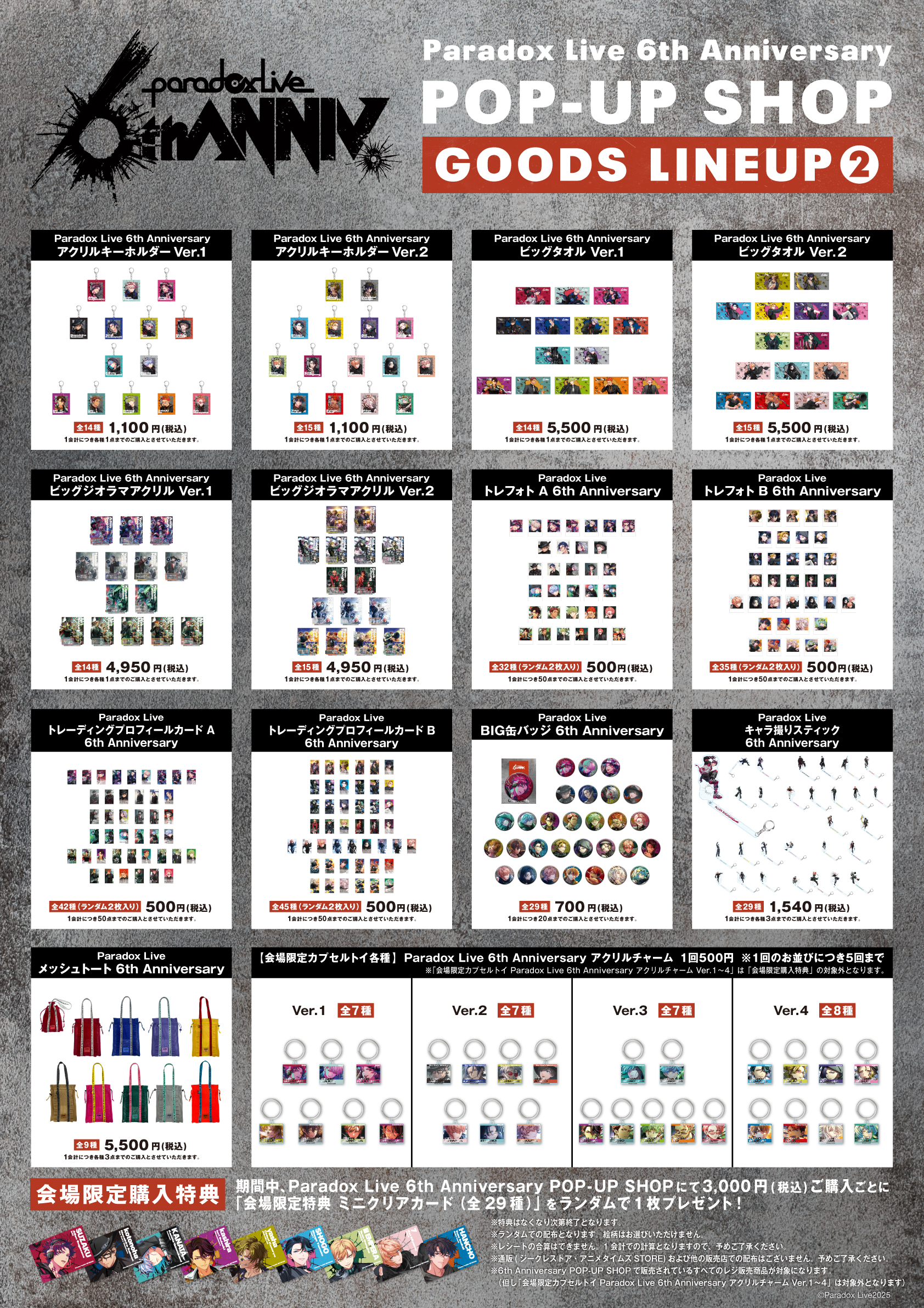 ※ 6th Anniversary POP-UP SHOPで販売されているすべてのレジ販売商品が対象になります。(「会場限定カプセルトイ Paradox Live 6th Anniversary アクリルチャーム Ver.1〜4」は対象外となります)