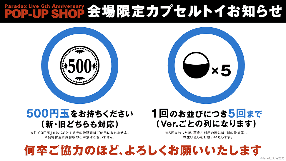 ・ 物販入場制限中や混雑中は、レジ列にお並びいただいての両替ができない場合がございます。お客様には大変お手数をおかけしてしまい恐れ入りますが、「500円玉」をご準備の上、ご来場いただけますと幸いです。