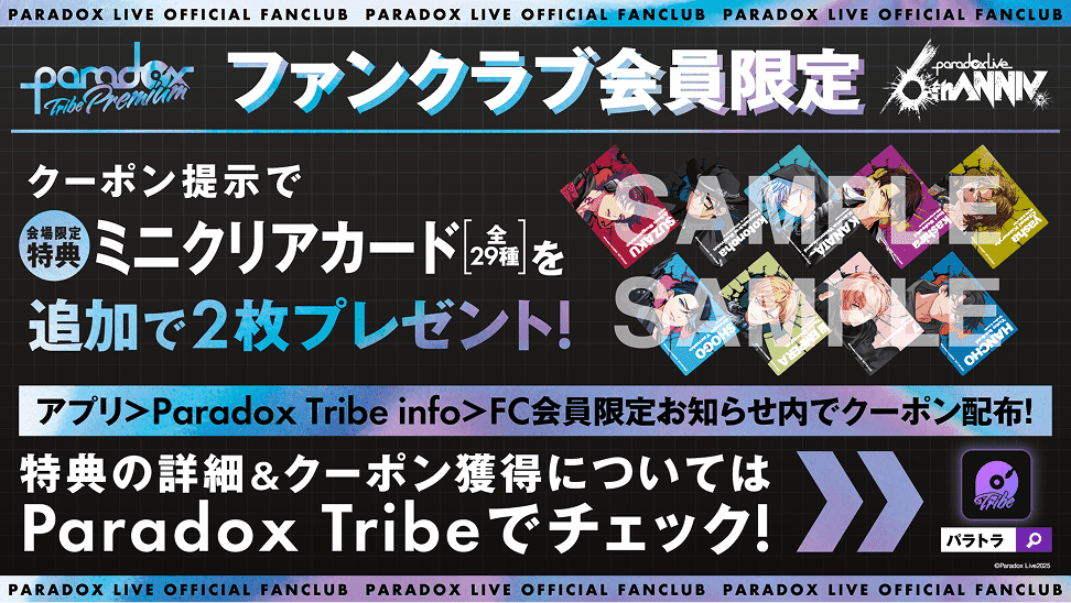 さらに、Paradox Live公式ファンクラブ"Paradox Tribe Premium"会員の方は、お会計時にクーポンをご提示いただくと、追加で2枚プレゼントいたします。